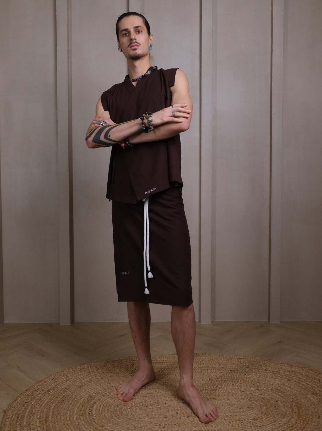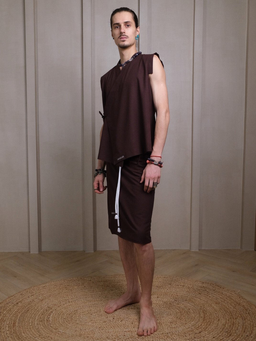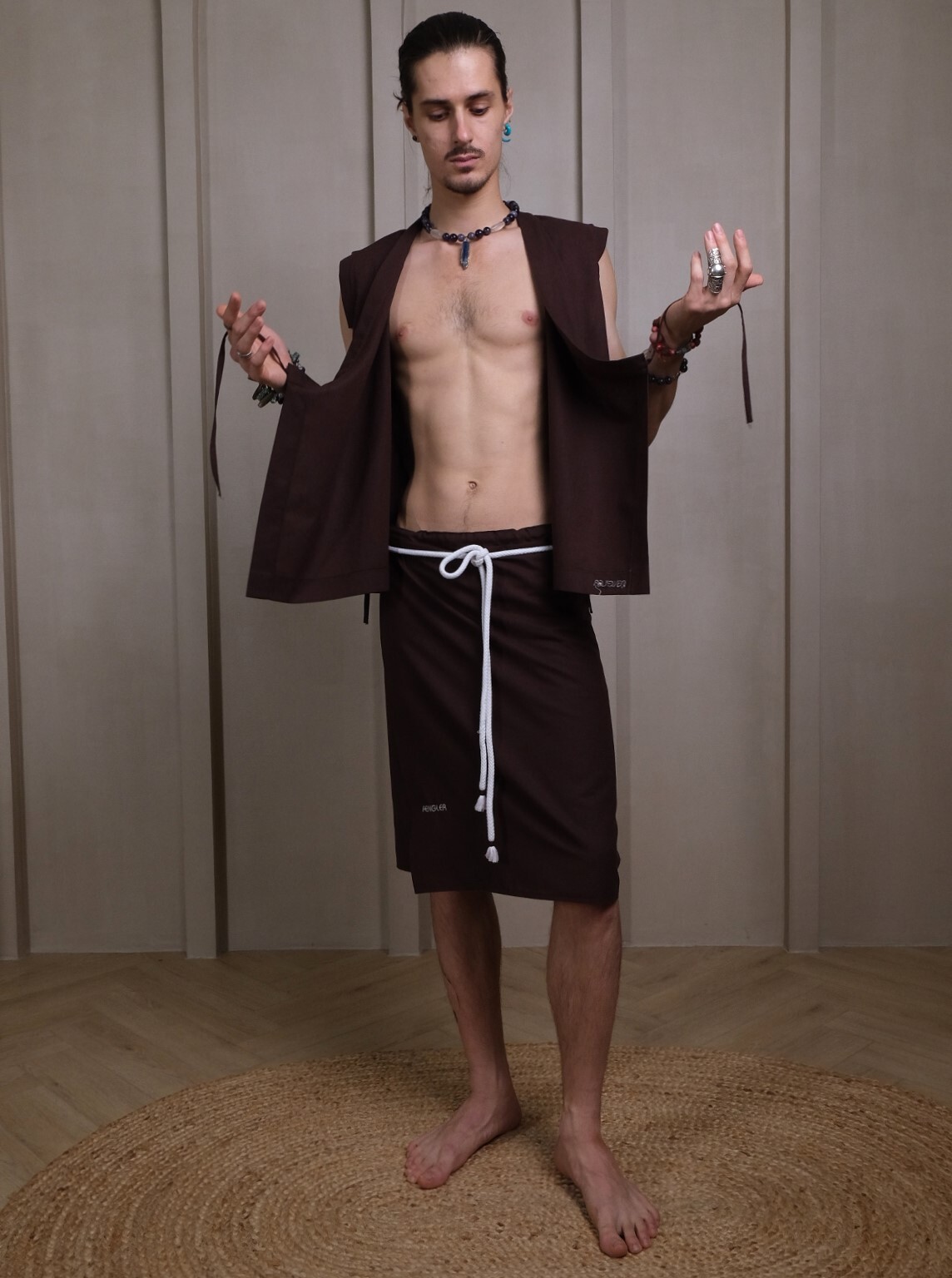 Вот представь, приходишь в баню, там все в простынках, а ты - вот так. Килт сделан из натурального материала с приятной текстурой льна, быстро сохнет, шнур опоясывает и служит оберегом.