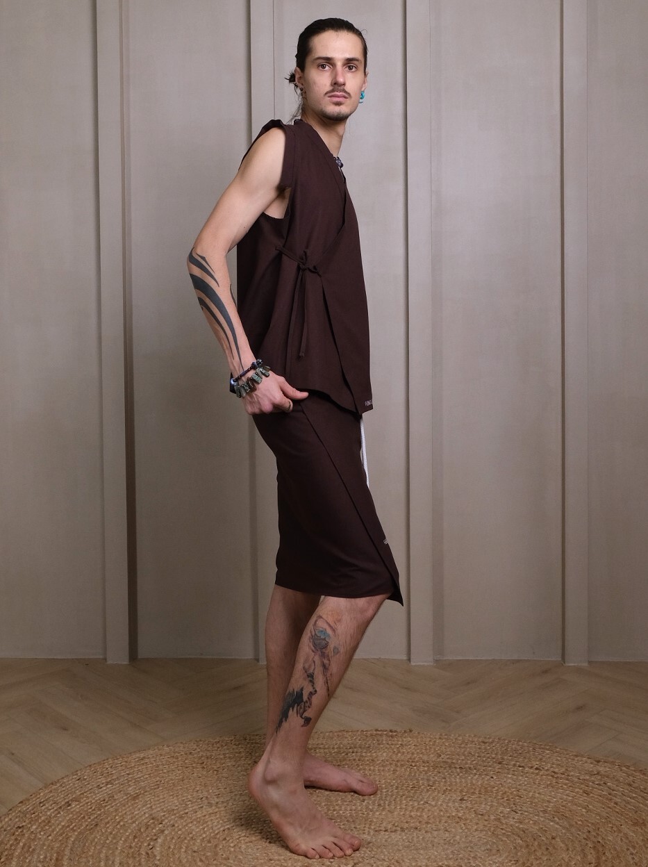 Почувствуйте истинный комфорт и элегантность с нашей безрукавкой в стиле кимоно. Изготовленная из натуральных материалов в благородном шоколадном оттенке, она дарит ощущение мягкости при каждом прикосновении, не сковывает движения и быстро сохнет.
